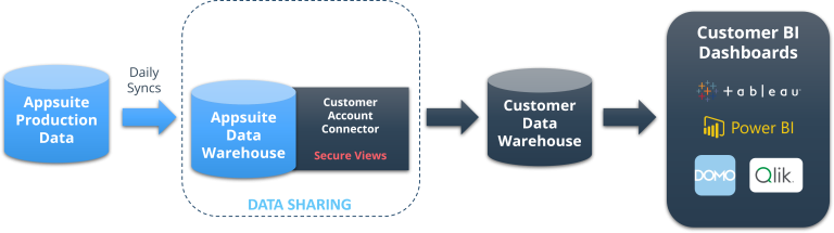 Appsuite Datahub provides an easy method to sync data between Appsuite’s data warehouse and a customer’s data warehouse. The Datahub uses the Snowflake cloud database platform to manage the sharing of data – customers control their own access and security while being able to incorporate data from the Appsuite services into their own Business Intelligence (BI) tools.
